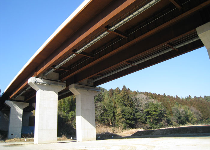 | 伸縮装置 | (しんしゅくそうち) | 橋桁は温度によって伸び縮みするので、桁と橋台、また桁と桁がぶつからないよう“あそび”を設けるために橋の継ぎ目に設置される装置のこと |