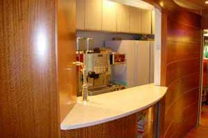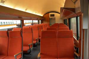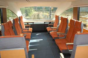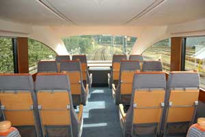 3・8号車には生ビールやカプチーノ等々が味わえるビュッフェスタイルのカフェの他、喫煙ブース、便所・洗面所等のサービス機能が集中的に配置され、天窓やフローリングの床など、一般車とは違った印象の空間となっています。なお3号車には4人グループ向けのサルーン席、8号車には身障者にも対応可能な席があり、車椅子による乗降に利用できる電動スロープ装置が出入口に装備されています。